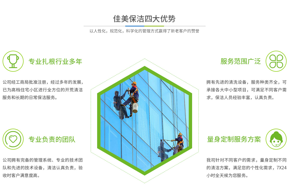 馬鞍山市佳美保潔服務(wù)有限公司是一家經(jīng)工商部門批準,具有法人資格專業(yè)清洗,馬鞍山保潔服務(wù)的公司,自創(chuàng)辦以來,一直致力于企業(yè),家庭,賓館,學校,別墅,酒店,商廈,公共設(shè)施等場所提供科學的日常保潔和清潔保護的服務(wù)公司,有著豐富的管理服務(wù)和保潔經(jīng)驗...
